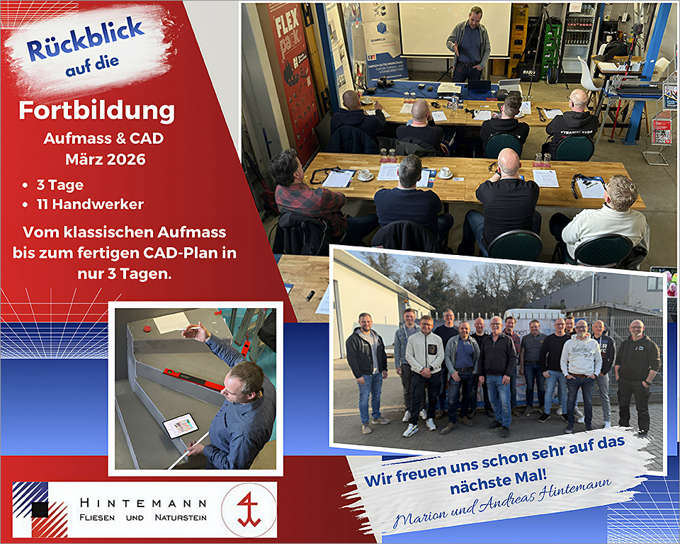 Vom 9. bis 11. März 2026 fand unter dem Kursleiter-Duo, von Andreas und Marion Hintemann in Ochtrup, unsere Fortbildung "Aufmaß & CAD-Einstieg" statt.